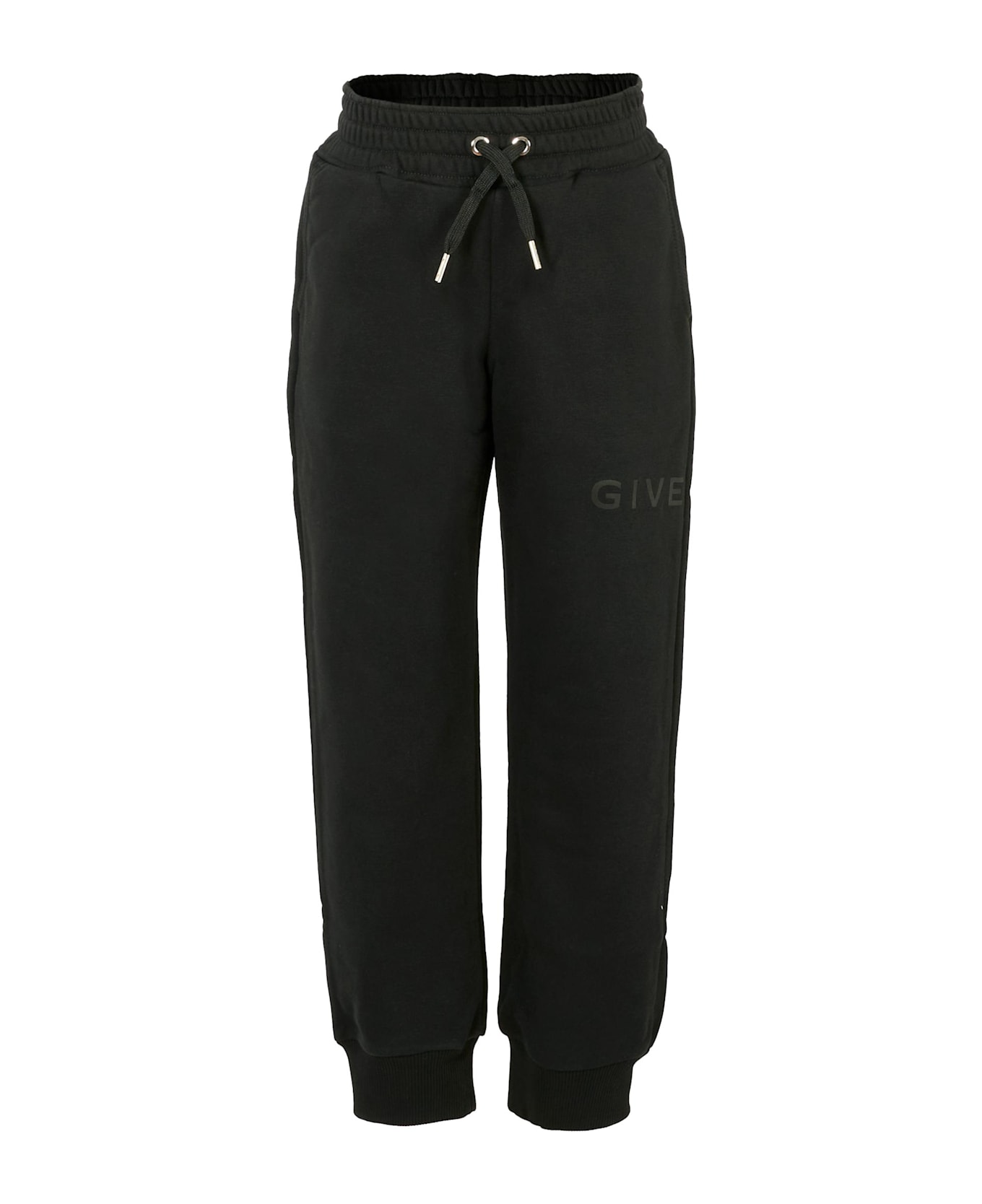 Black trousers from the luxury brand Givenchy Kids, made of gauzed cotton blend. They feature an elasticated waist, drawstring, side pockets, a back pocket and ribbed ankles. They are embellished with logo around one leg.