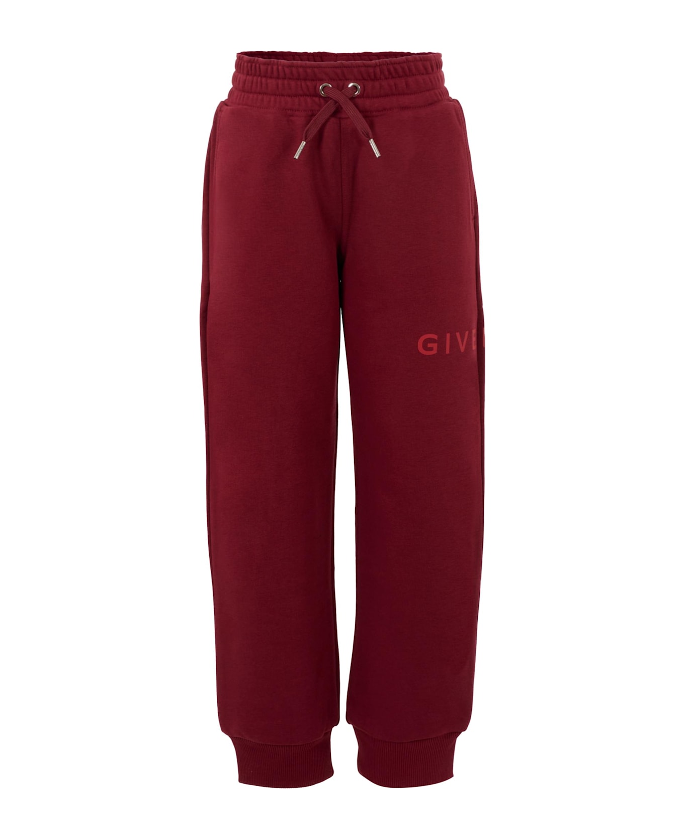 Burgundy trousers from the luxury brand Givenchy Kids, made of gauzed cotton blend. They feature an elasticated waist, drawstring, side pockets, a back pocket and ribbed ankles. They are embellished with logo around one leg.