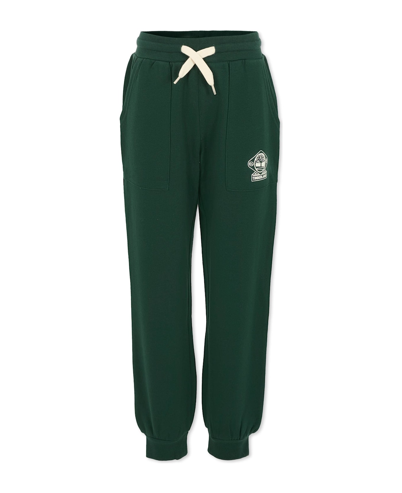 Green trousers in a fleece-lined organic cotton blend, featuring an elasticated waistband, drawstring, side pockets, and ribbed cuffs. They are embellished with a logo print on the leg.