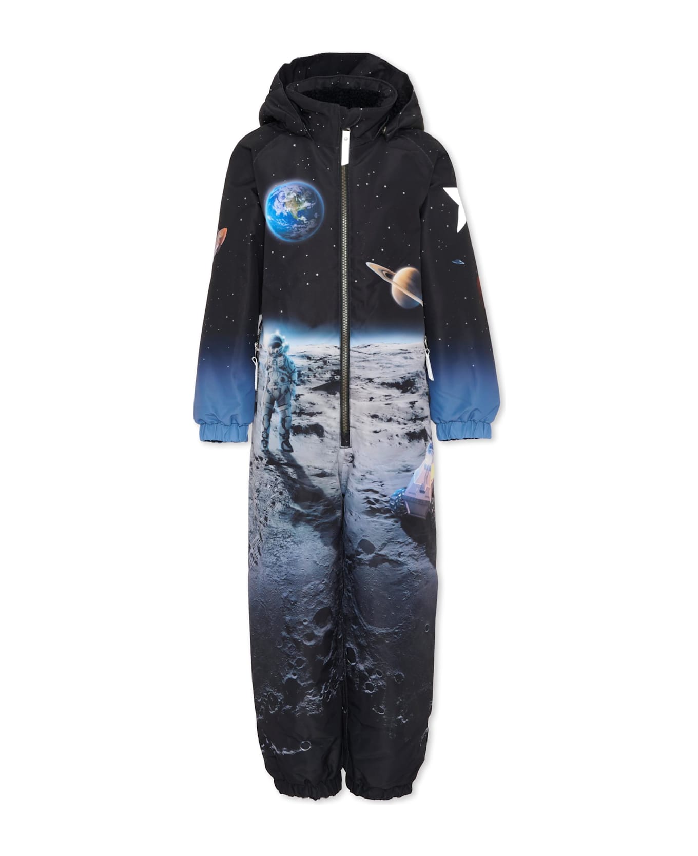 Black, padded, waterproof snowsuit with a faux shearling lining, a removable hood, a front zip fastening, side zip pockets, elasticated cuffs and ankles, and drawstrings. It is embellished with an all-over space print.