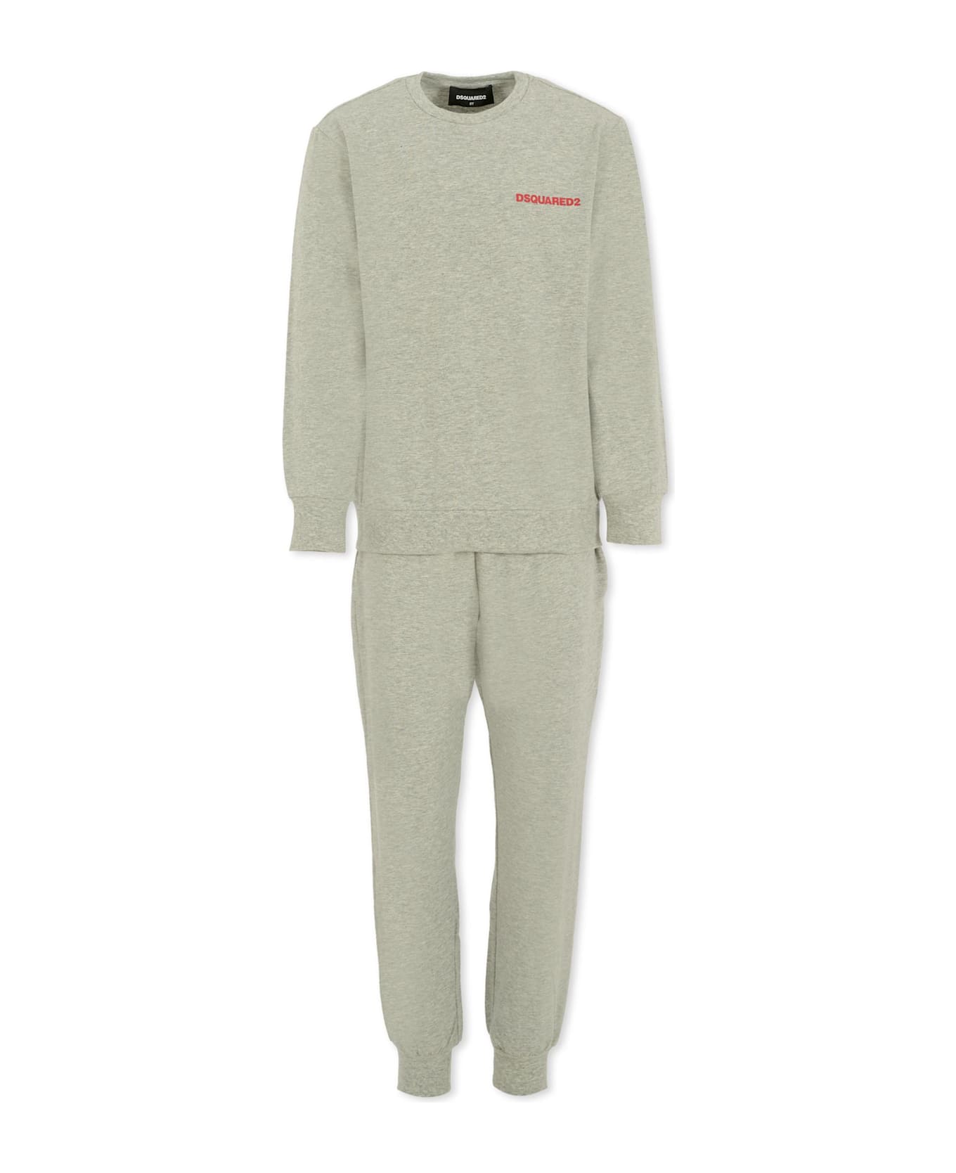 Grey cotton blend pajamas, composed of a T-shirt and pants. The long-sleeved T-shirt features a crew neck, ribbed cuffs, and hem; it is embellished with a red logo on the chest. Trousers with elasticated waistband with logo, side pockets and ribbed ankles.