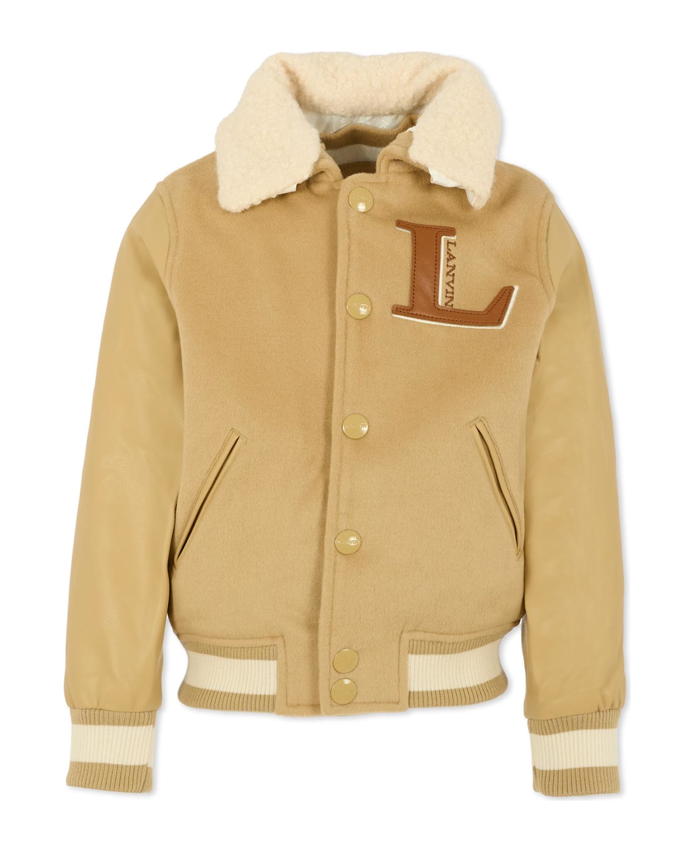 Beige bomber jacket from Lanvin Petite, crafted from a wool blend. It features long faux leather sleeves, a pointed collar with a removable faux shearling detail, practical side pockets, and striped ribbed cuffs and hem. It fastens with snaps on the front for easy dressing. It is dembellished with L logo on the chest and Lanvin logo on the back.