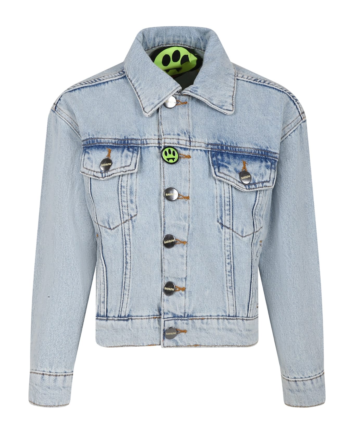 Denim blue denim jacket, long sleeves, with pointed collar, front button closure, side pockets and pockets with flap and button on the chest. It is embellished with iconic smile on the front and with logo and smiley on the back. It comes with a yellow logo key ring.