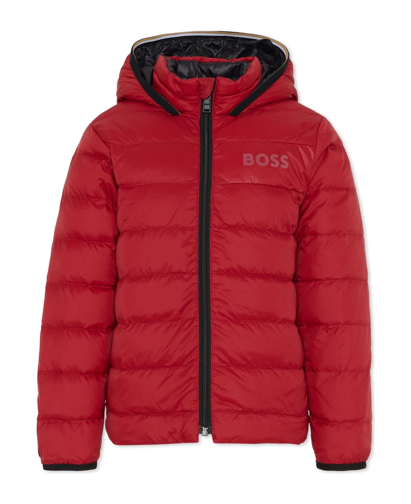 Reversible red and black lightweight down jacket, padded and quilted, with long sleeves, a hood, a front zip closure, and side pockets. It is embellished with a logo print on the chest.