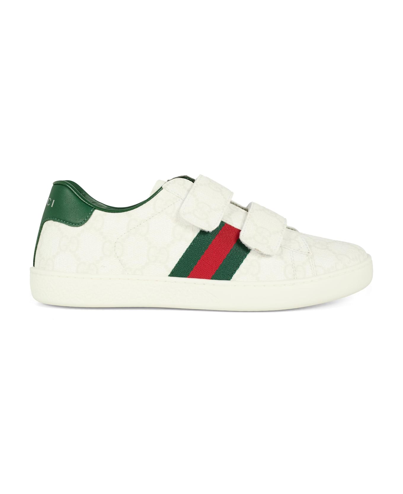 White Ace sneakers from the luxury brand Gucci Kids, in GG Supreme fabric, with rubber sole, velcro closure, green detail on the back, and round toe. They are dembellished with a green and red Web detail on the sides and a logo on the back.