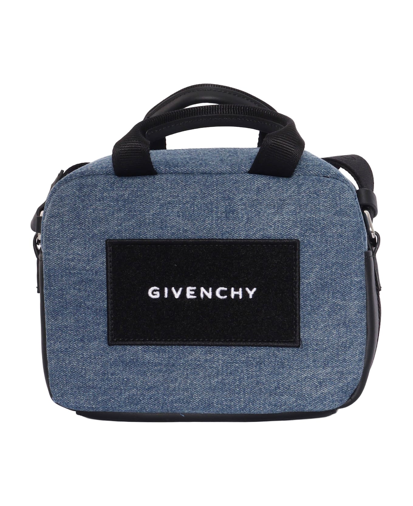 Shoulder bag, polyamide, denim and cow leather, adjustable shoulder strap with Givenchy print, cow leather details, removable wallet with Givenchy print on the front, transparent window for name label. Mineral tanning. Dimensions: 15cm x 21cm x 8cm.