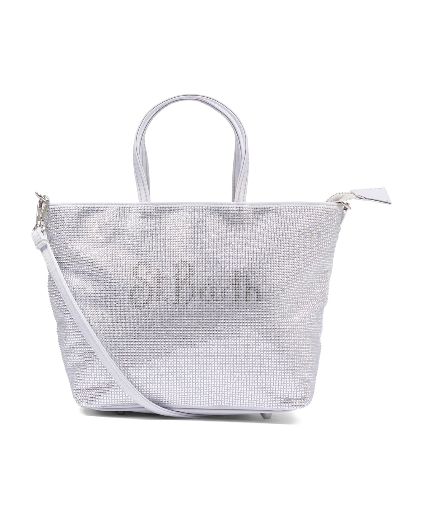 Silver rhinestone bag with handles, top zip closure, and removable shoulder strap. It is decorated with logo on the front.