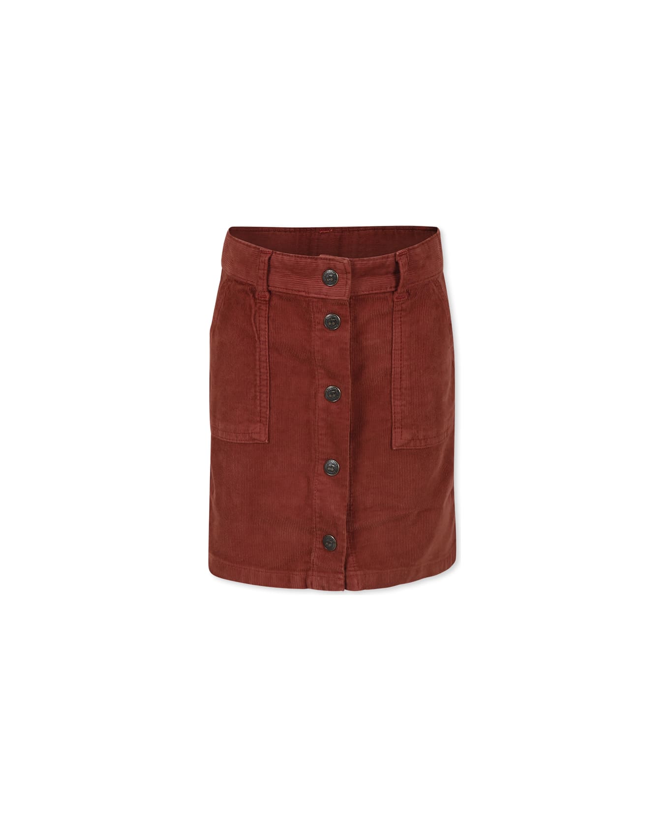 Burgundy corduroy skirt, with belt loops, front closure with snap buttons, adjustable waist thanks to internal elastic with buttons, side and back pockets. It is embellished with a logo patch on the side.
