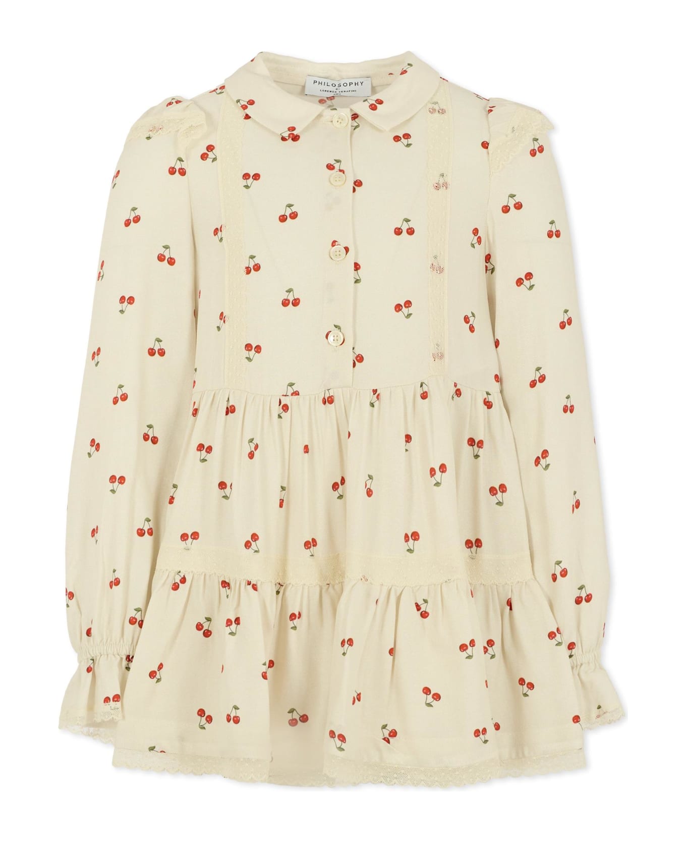 Ivory twill dress with long sleeves, a pointed collar, a front button closure, ruffled shoulders, lace details, elasticated cuffs, and a flounced hem. It is embellished with an all-over cherry print.