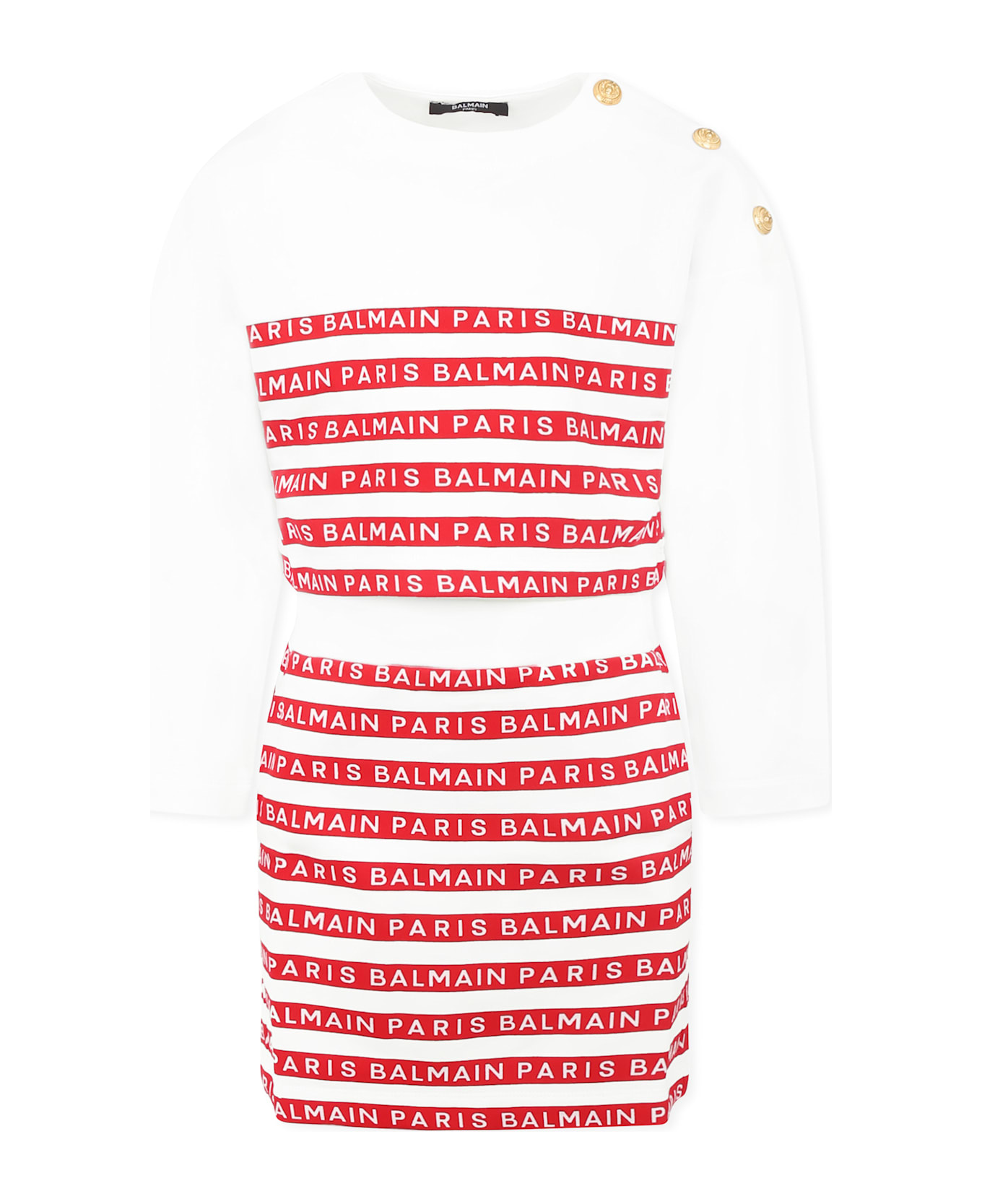 White organic cotton brushed sweatshirt and skirt suit. Long-sleeved crop sweatshirt with ribbed crew neck and iconic gold snap button closure on the shoulder; skirt with elastic waist and side pockets. It is embellished with contrasting red stripes and Balmain logo.