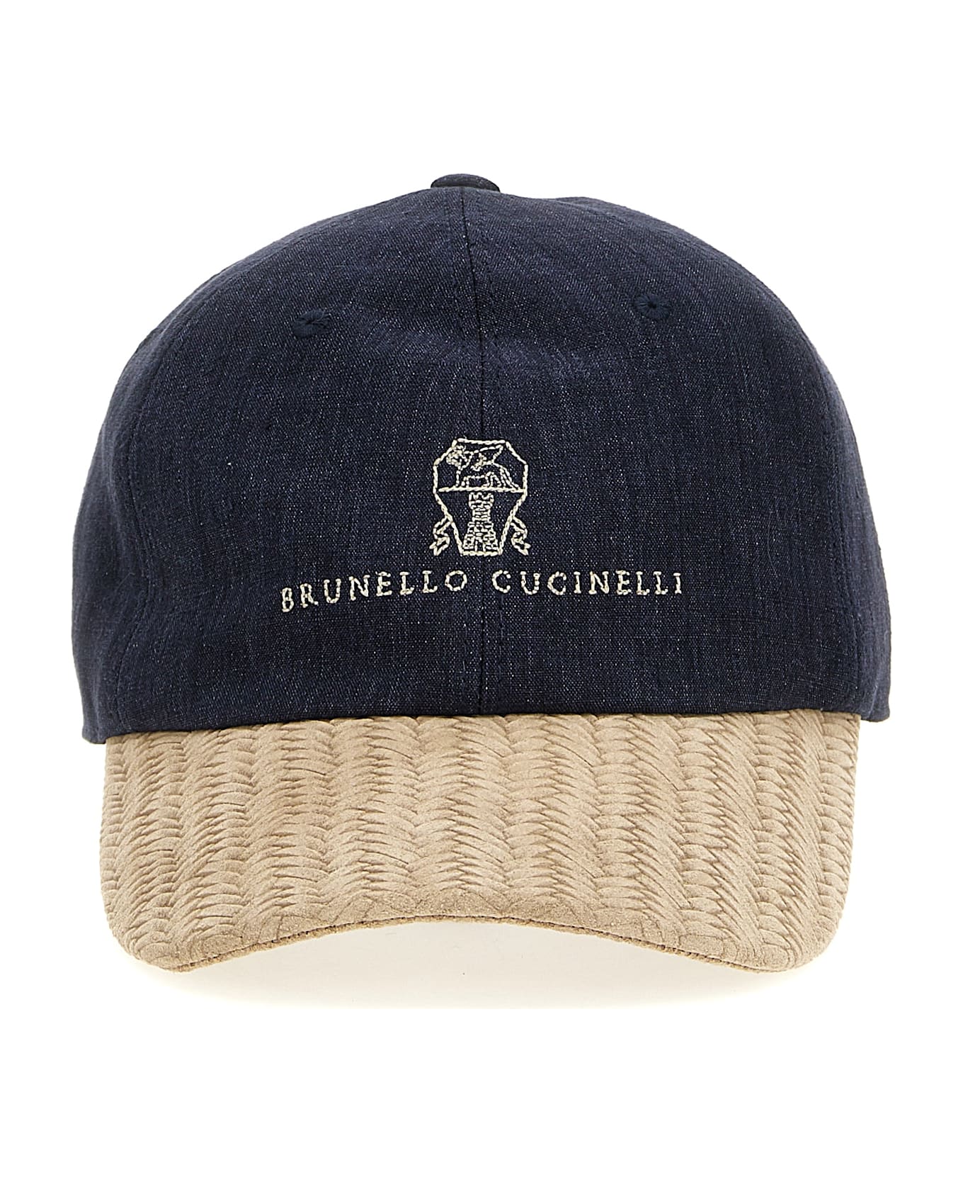 Denim print linen cap with contrasting logo embroidery on the front, woven suede visor, adjustable back strap. Composition: 100% linen