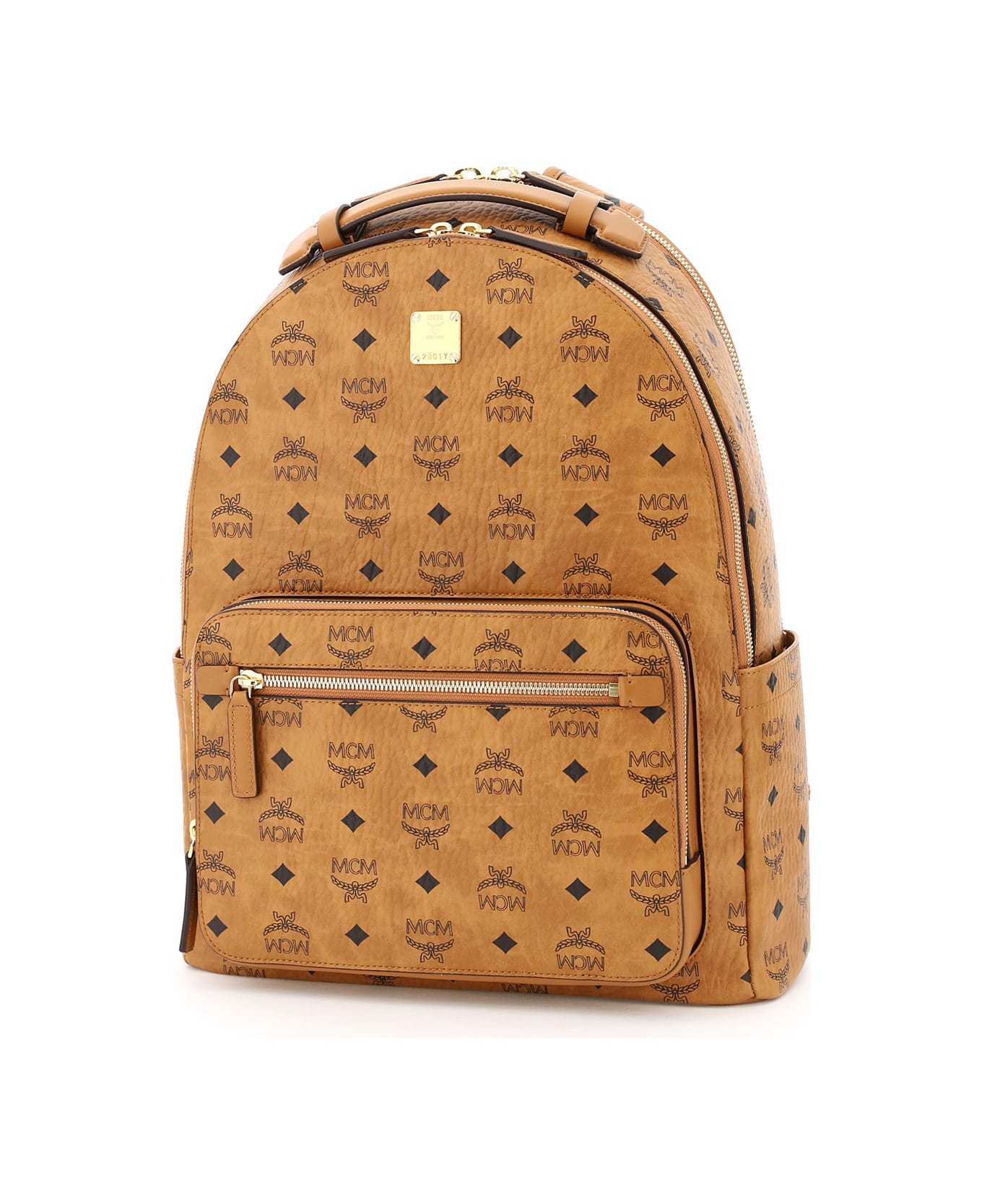 Stark 40 backpack by MCM in the iconic "Visetos" with all-over monogram print and leather details. Metal logo plaque on the front, sliding leather handle, adjustable padded shoulder straps, main compartment with one flat pocket, back compartment with one l