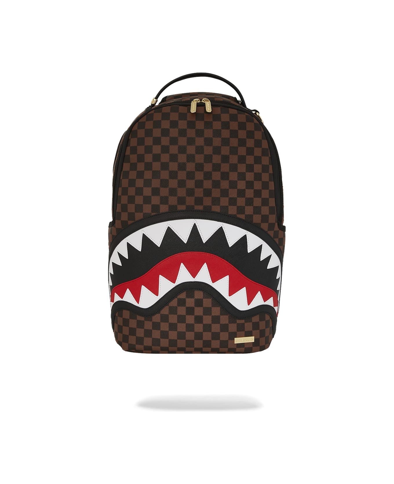 Unisex backpack with bold streetwear flair, perfect for travelers who want to stand out. Made of water-resistant faux leather, it features a brown and black checkered pattern and the signature shark mouth graphic in white, red, and black on the front. It includes front and side pockets and a separate velvet-lined sunglass compartment, plus a padded laptop sleeve. Adjustable straps, padded ergonomic back, and a rear sleeve to attach to carry-on luggage make it ideal for daily use and travel.