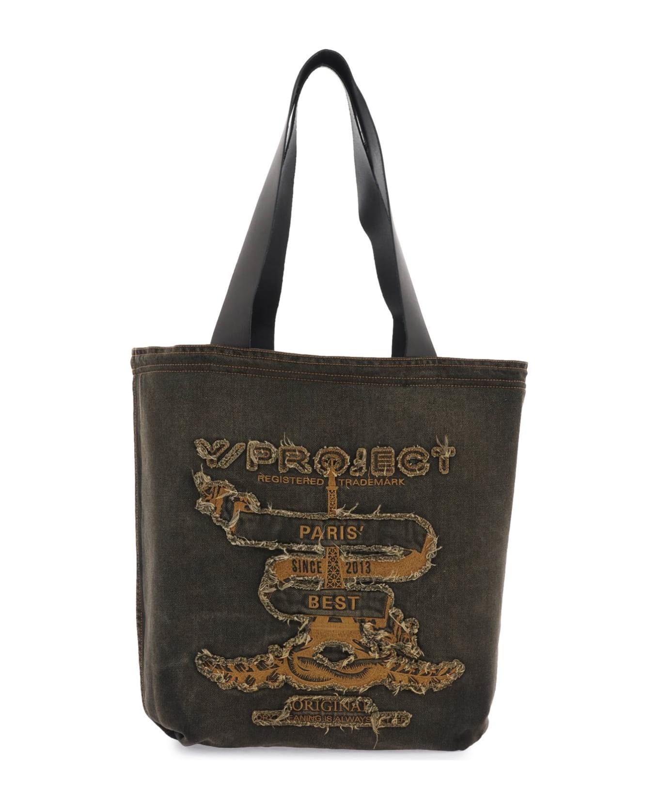 Tote bag by Y/PROJECT made of pure cotton used-effect denim and characterized by maxi lettering embroidery at front with distressed details. It features double leather handles, lightly padded twill-lined interior with logo patch.