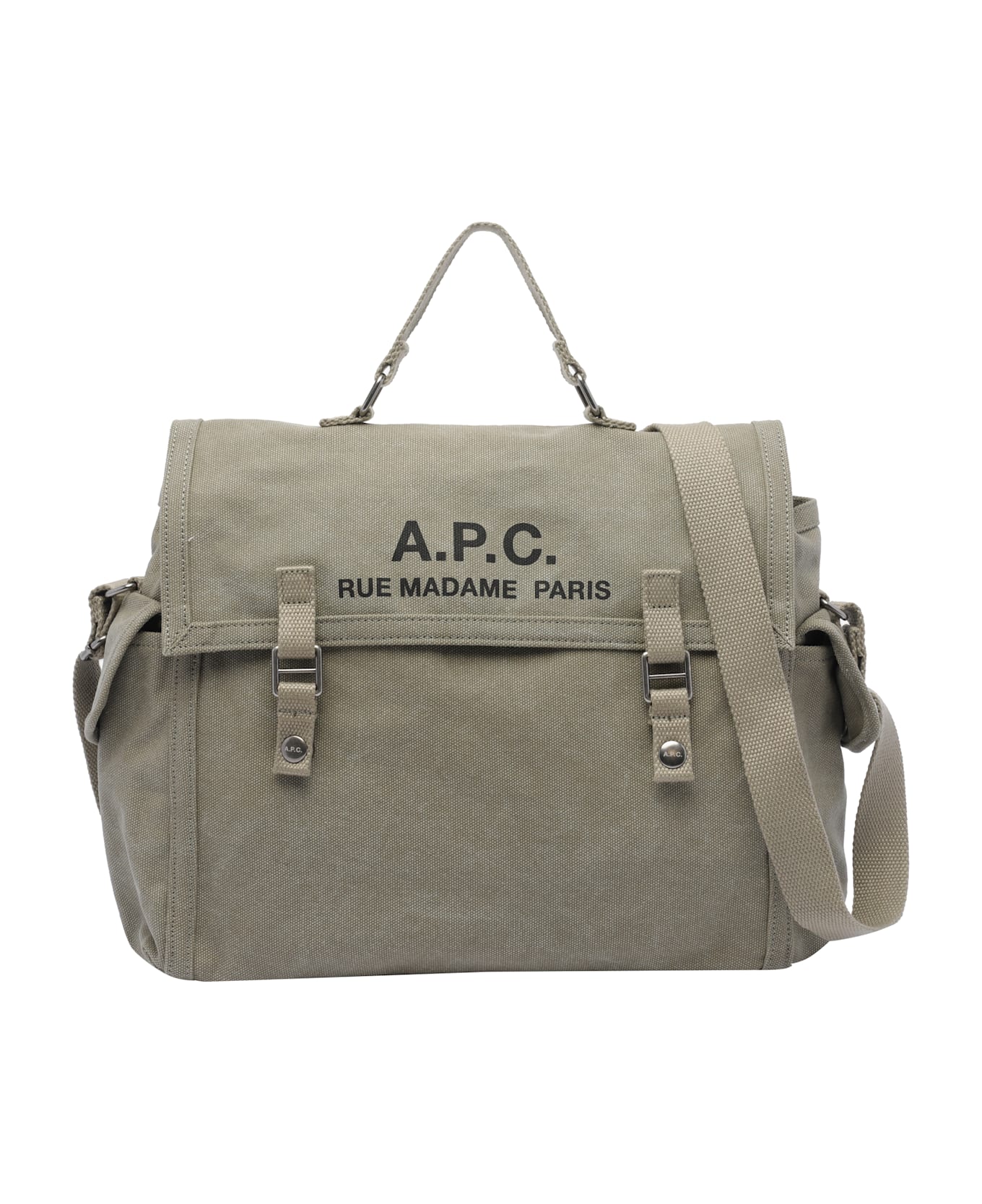 A. P. C. military green Recuperation satchel, clip magnetic closure, lateral clip pockets, 2 inner sections, adaptable strap, frontal logo Composition: 100% Cotton
