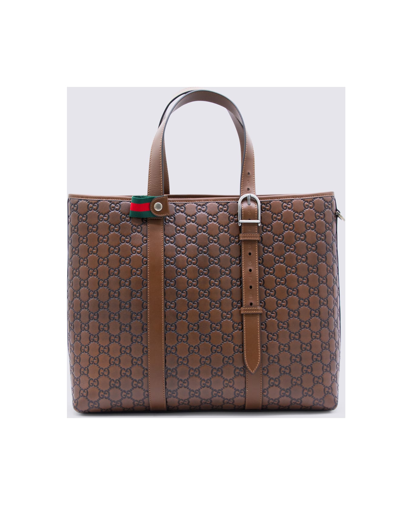 Brown Shopping Gg Emblem Big Tote from Gucci featuring top handles, upper fastening, gold tone hardware, all over embossed logo and pockets. Composition: Calf Skin