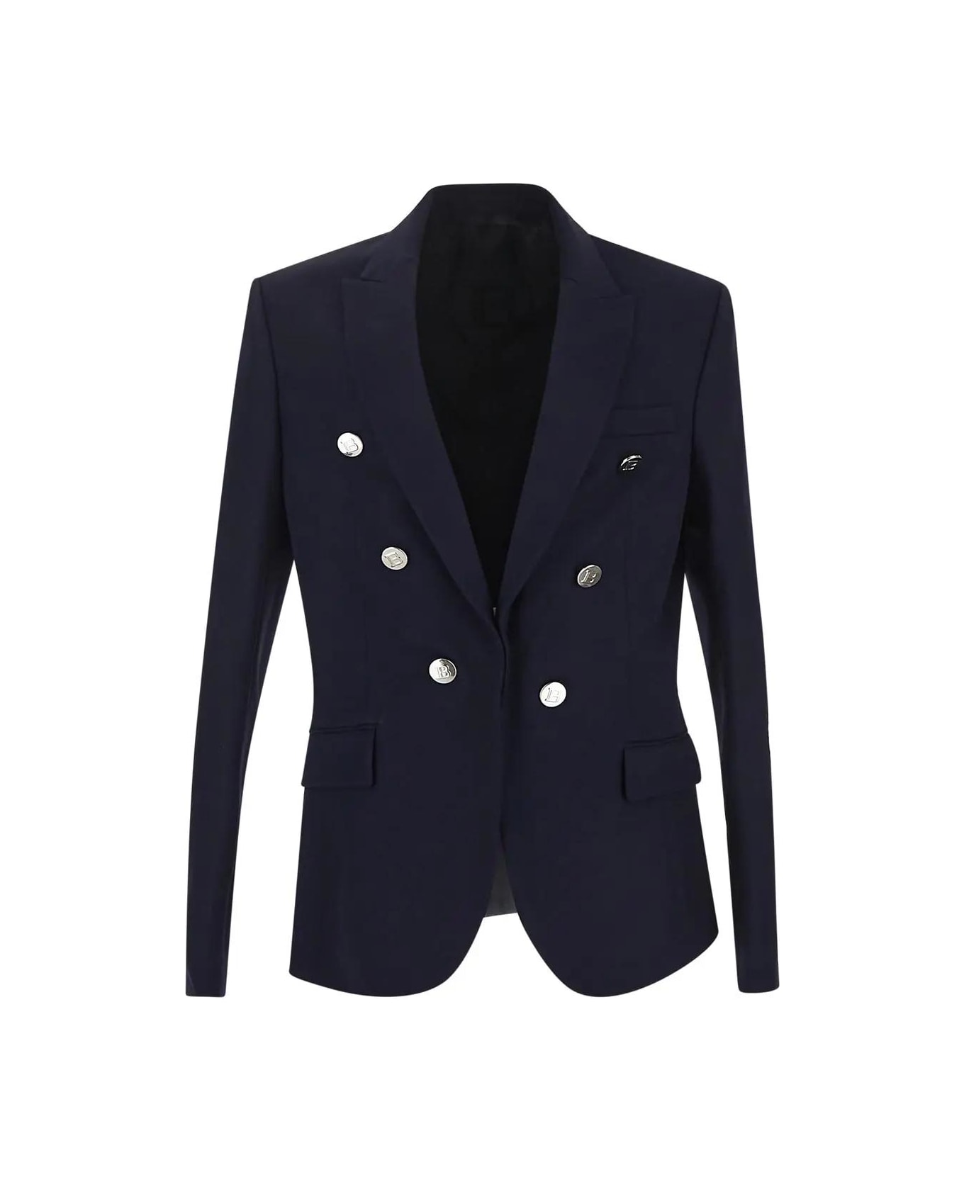 Balmain jacket in navy blue wool with structured shoulders, long sleeves, tailored neckline with peak lapels, invisible hook fastening, six decorative silver metal buttons, a chest pocket, two side pockets with flap, tailored cuffs with three silver metal buttons, tight fit and central back split.