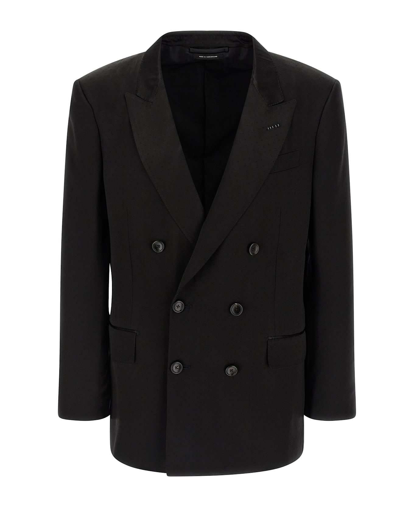Blazer in viscose blend and glossy fluid silk with tone-on-tone micro polka dot pattern, double-breasted style with front horn button closure, peak lapels, breast pocket, flap pockets, structured shoulder strap, cuffs with open buttonholes, back slits, cupro and silk blend lining, and three inner pockets.