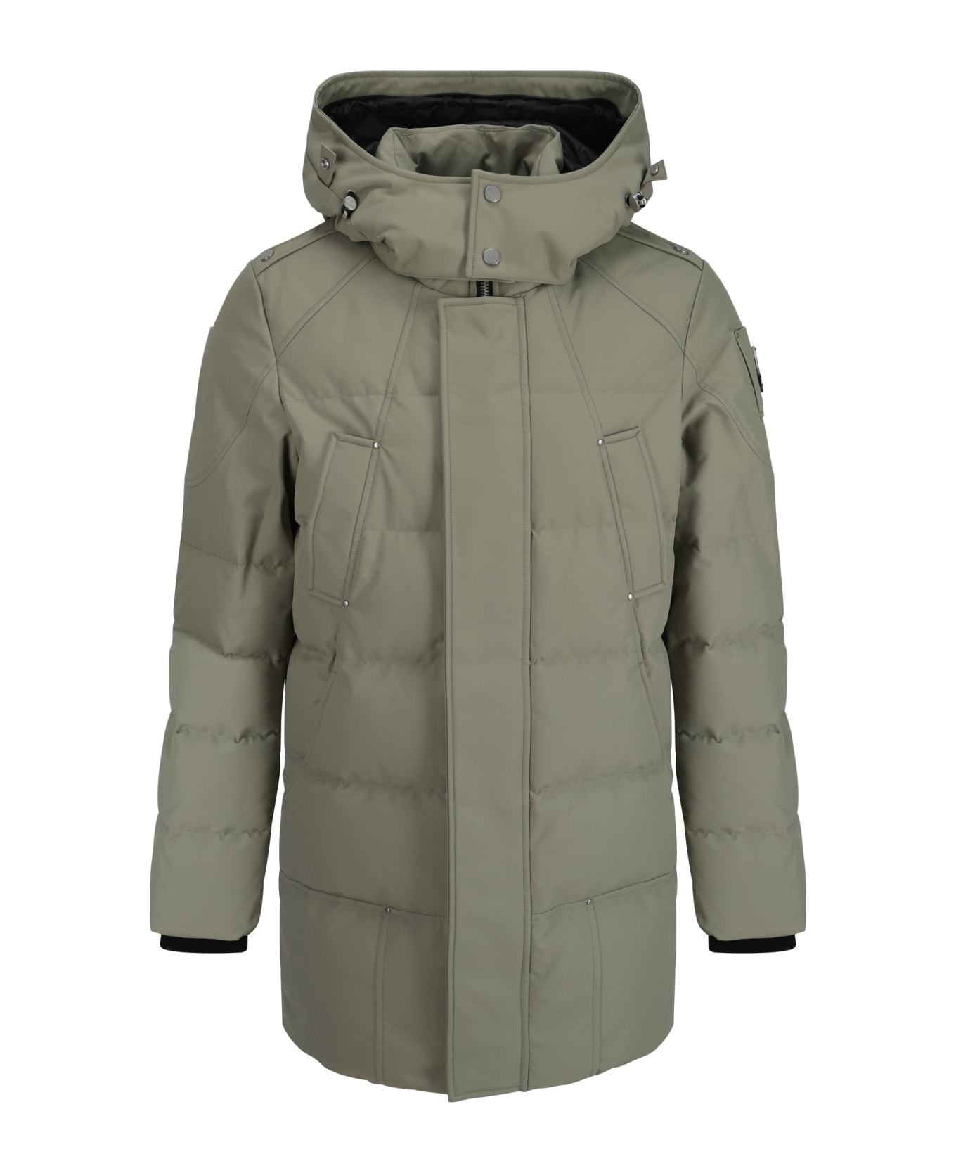 Cloud down jacket by moose knuckles, design with removable drawstring-adjustable hood, double-slider front zipper and button closure, two side welt pockets, two front flap welt pockets, zipper-adjustable cuffs, all-over padded and quilted design, monochrome pattern, regular fit.