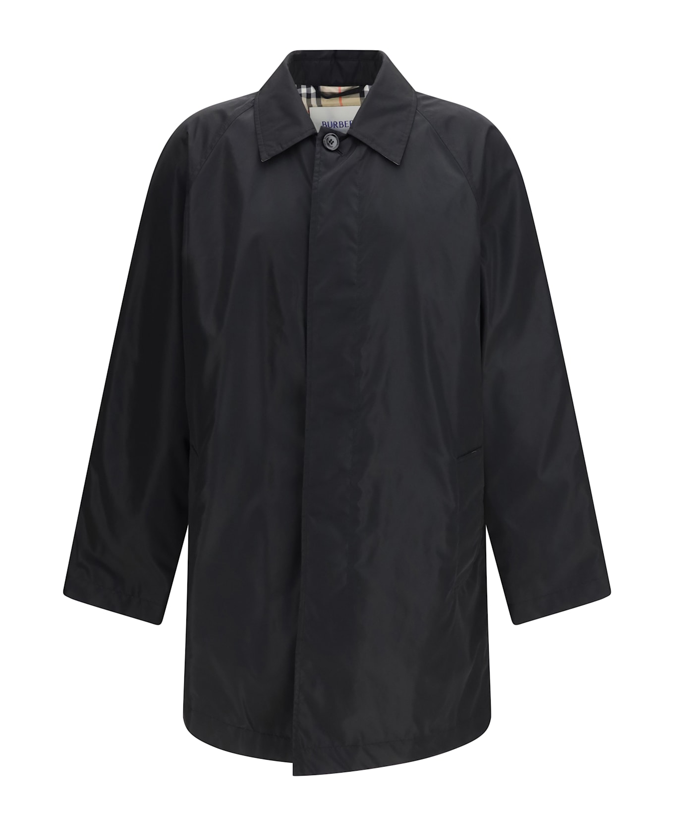 The nylon coat by burberry combines elegance and functionality in a refined design. it features a single-breasted button closure, a chin strap, and cuffs with buttoned tabs. the lining and collar lining in the iconic burberry check, along with the silicone label featuring the equestrian knight design on the sleeve, complete the garment with distinctive and recognizable details.