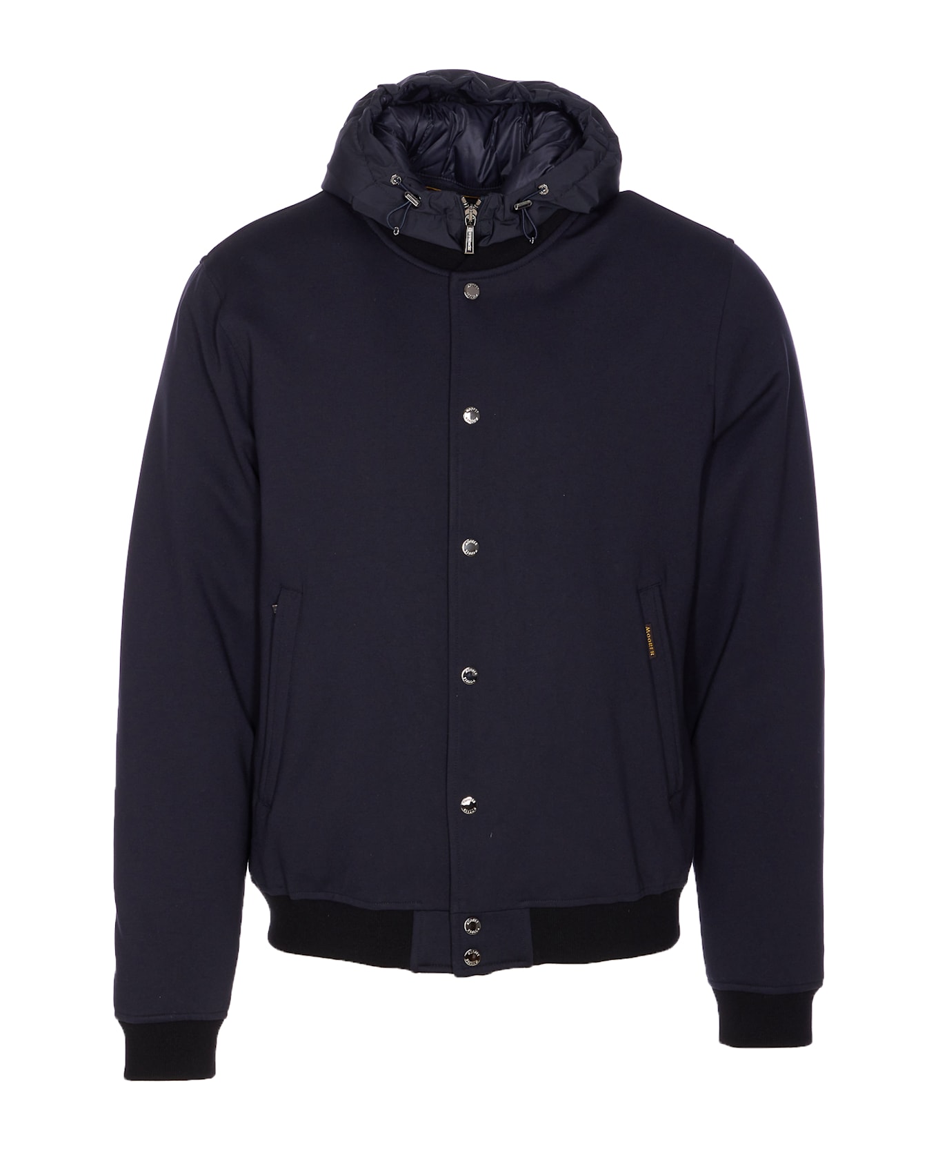 Moorer dark blue Callum down jacket with zip and buttons closure, removable hood detail, long sleeves, zip pockets, padded, elasticized on waist and on cuffs Composition: 5% Elastane, 30% Polyamide, 65% Viscose