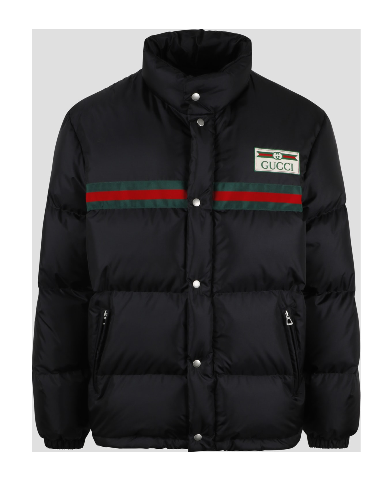 Gucci down jacket , in quilted water-repellent nylon embellished with Web Stripe and Gucci Vintage label. - FW23