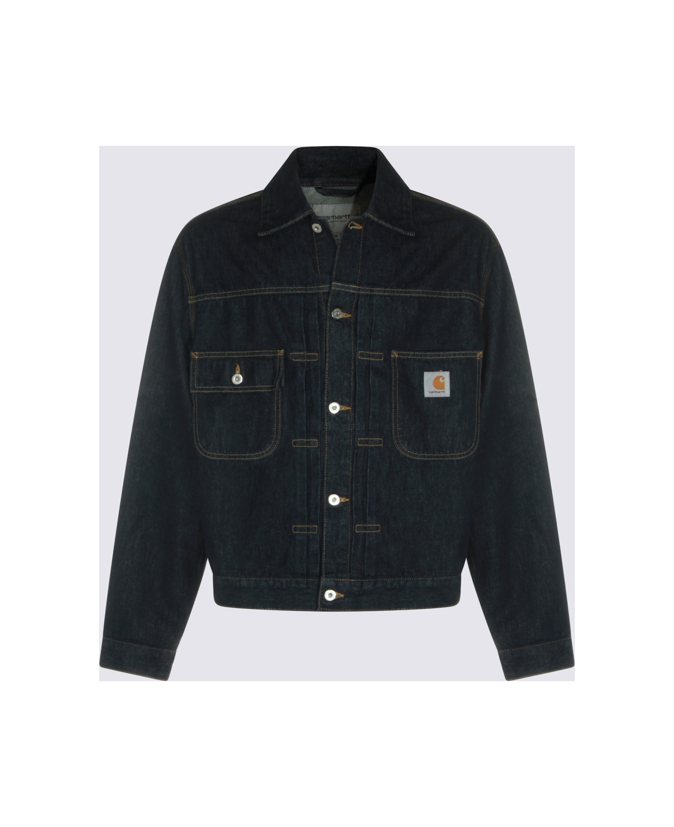 Dark blue cotton Belmar denim jacket from Carhartt WIP featuring long sleeves, metal buttons closure, chest pockets, logo patch and regular fit. Composition: 100% Cotton