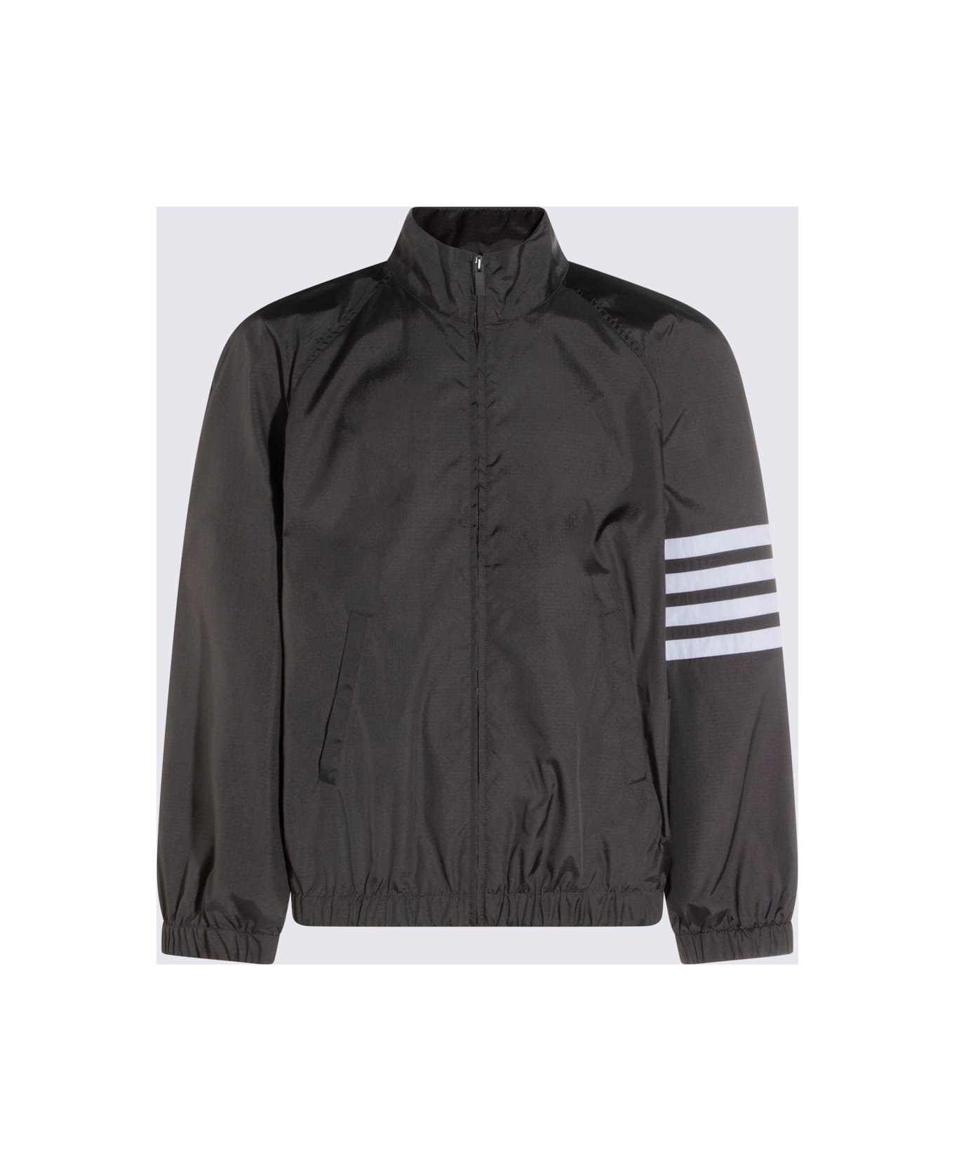 Dark grey casual jacket from Thom Browne featuring long sleeves, high neck, zip fastening, sleeve logo stamp, elasticated waist, pockets and regular vestibility. Composition: _, 81% Polyamide, 19% Polyester