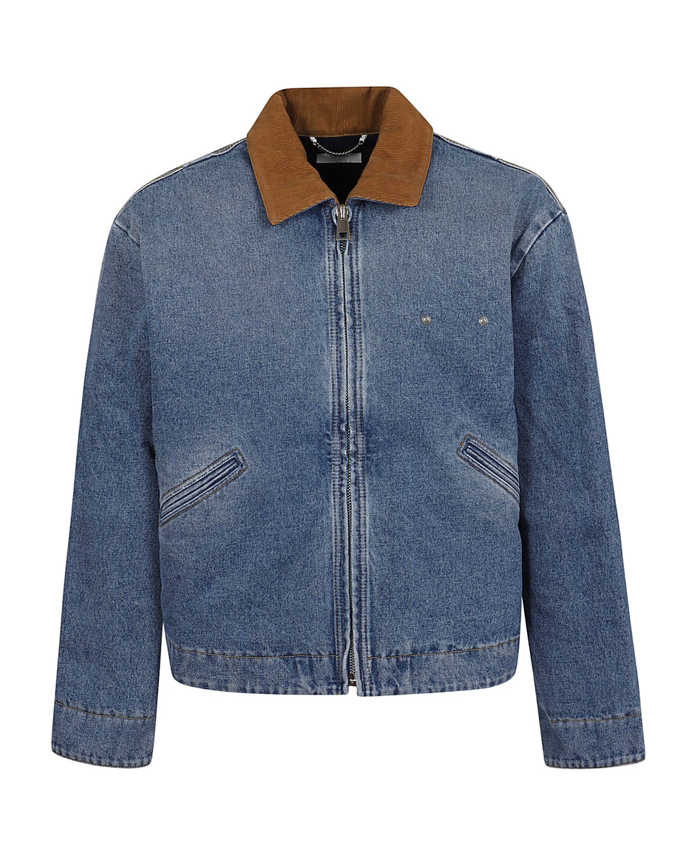Cotton denim bomber jacket BY 1989 STUDIO. Front zip closure; welt pockets; long sleeves, buttoned cuffs. Brown corduroy collar detail and metal logo plate with contrasting logo embroidery on the back.