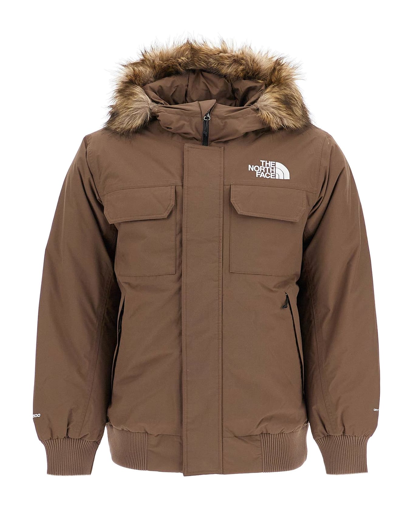 Crafted from weather-resistant DryVent fabric and padded with warm recycled down, this bomber jacket by The North Face features a comfortable fit with ribbed cuffs and hem and an adjustable hood with detachable faux fur trim. The outerwear is closed with a hidden zip and velcro closure and has four external pockets and one internal pocket. Iconic TNF logo embroidered on the chest and back. Quilted lining. The model is 182 cm tall and wears size M.