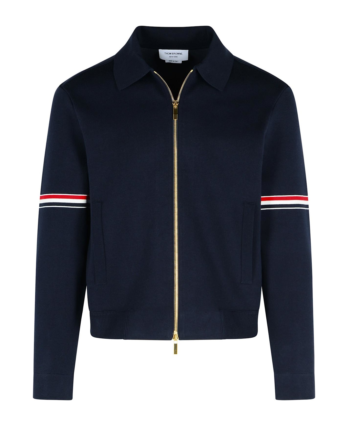 Ribbed square collar, double slider zip front closure, side welt pockets, tricolor detail on the sleeves, grosgrain label on the back of the neck, button cuffs, ribbed hem Composition: 100% cotton