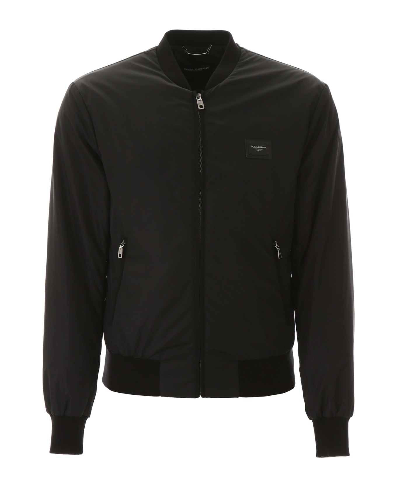 Dolce & Gabbana nylon bomber jacket with light padding and two inside zip pockets. It features front zip closure, side zip pockets, micro-ribbed neck, cuffs and hem. Rubber logo label on the chest, grosgrain trims. Model height is 183 cm and he is wearing a size IT 48. Composition: 100% poliestere, 98% seta, 04% elastan