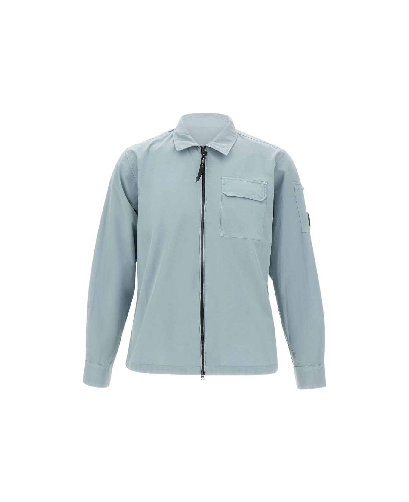 light blue flap chest pocket lens detail on sleeve buttoned cuffs zip fastening C. P. Company suggests removing any detachable accessories before washing.