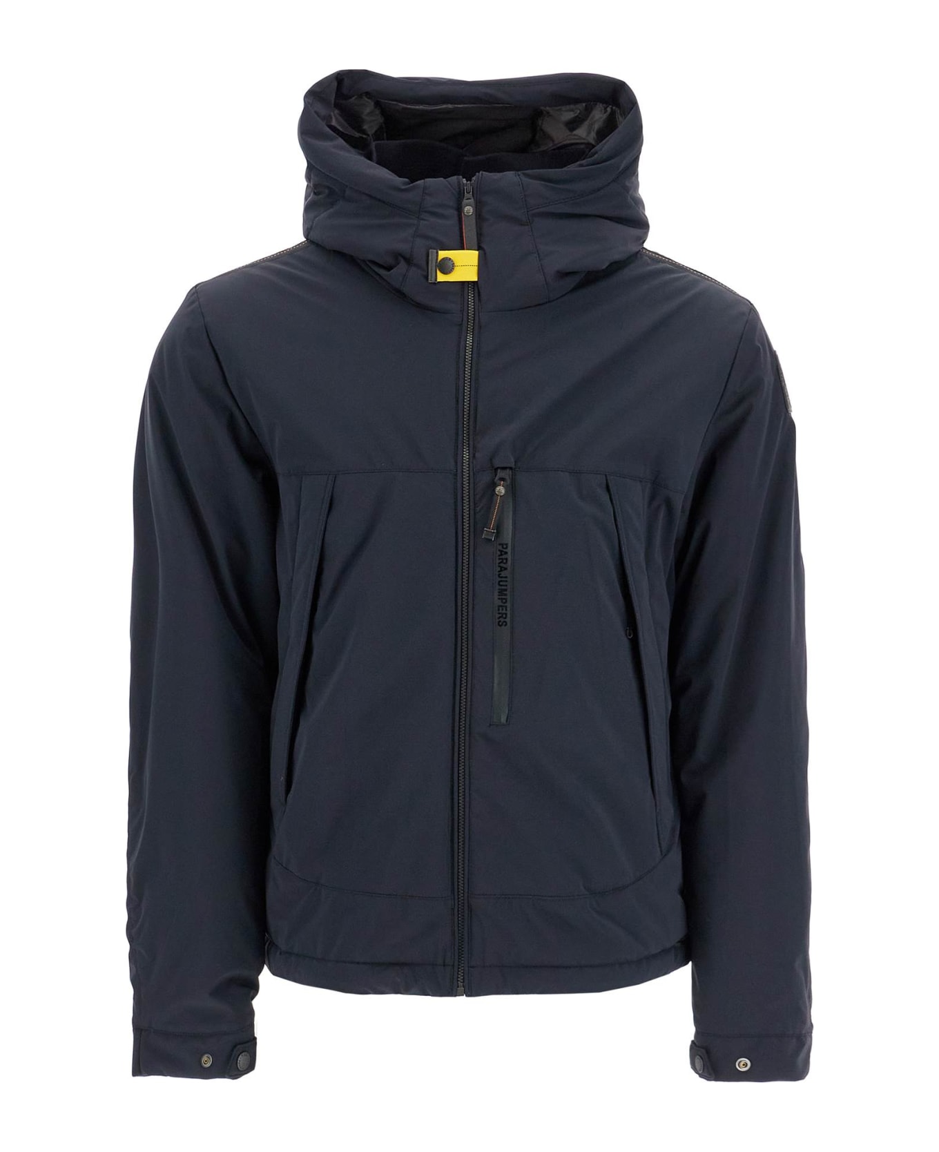 Short Parajumpers jacket made of technical stretch fabric with a matte finish and light polyester padding. It features a hood with the iconic yellow strap at the neck, ribbed inner collar, front zip closure, three external pockets with zips, and adjustable cuffs. Signed with a logo patch on the left sleeve, it is lined and has an internal pocket. Regular fit. The model is 187 cm tall and wears a size L.
