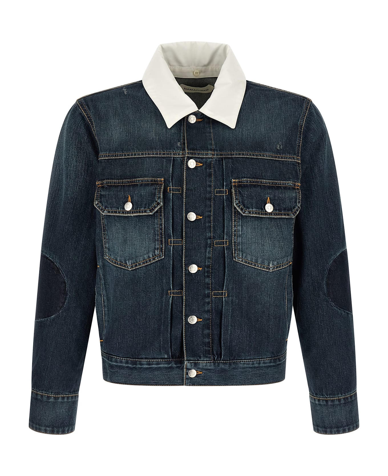 'Laguna' jacket in cotton denim aged by brushing over the entire surface and washed with stones, contrast stitching, double shirt collar, one of which in Removable contrast cotton, front metal button closure, pockets, long cuffed sleeves, dropped shoulder and contrast elbow patch.