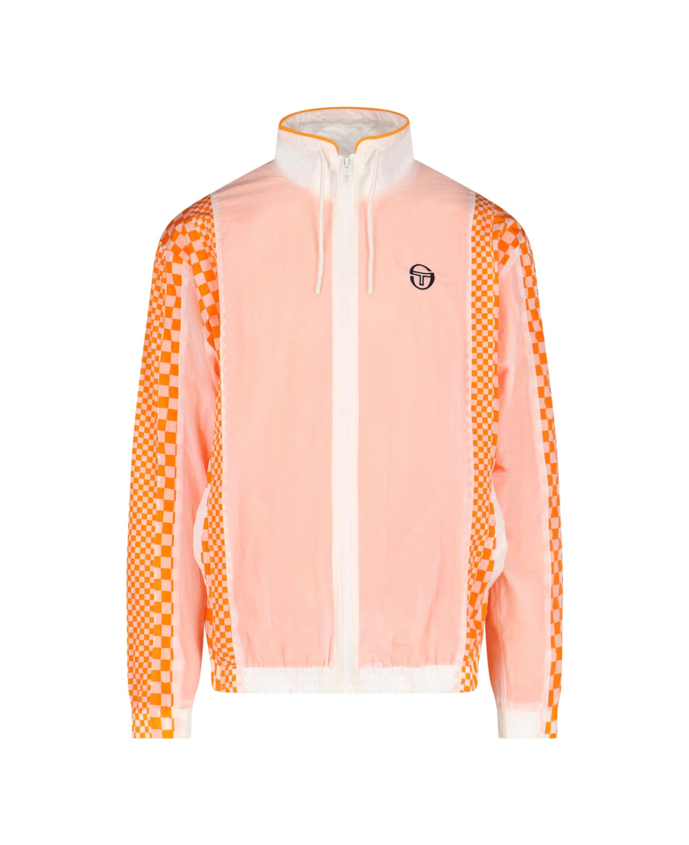 Sergio Tacchini logo zip jacket in orange nylon with striped pattern, adjustable high neck with drawstring, zip closure, zipper charm detail, black logo embroidery on the chest, two side pockets, elasticized hem.
