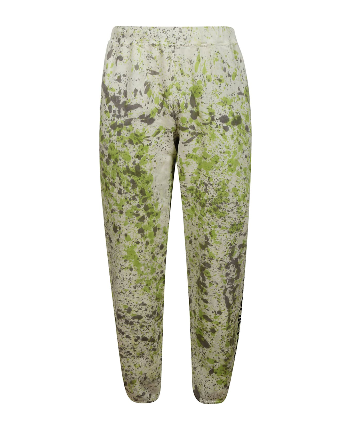 Aries Cotton trousers, white with green and black pattern, elastic waist, side "no problem" print detail.