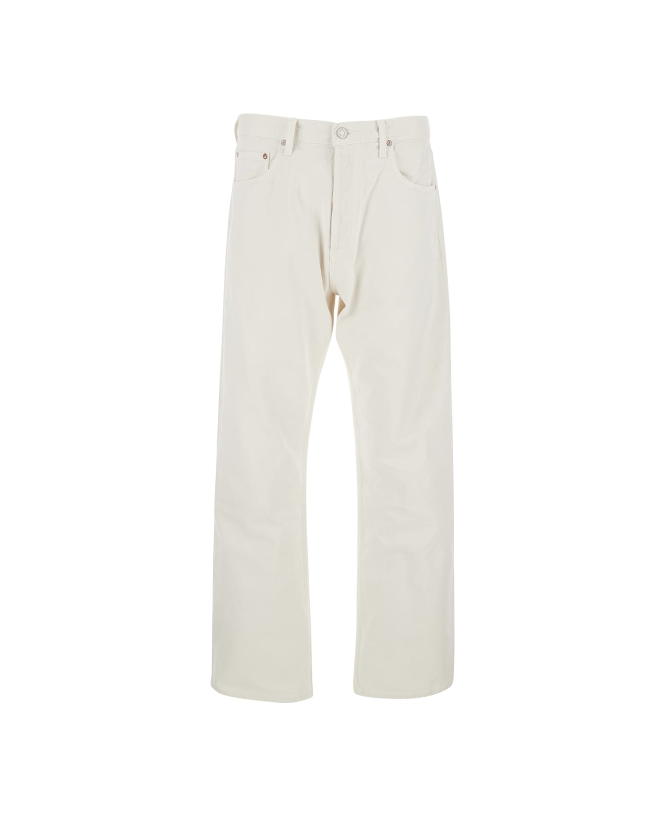 Five-pocket jeans, white color. They feature a zip and button closure at the front and a high waist. At the back, there are two patch pockets. The leg is straight and the hem is straight. Made of Regenerative Cotton. Regular fit.