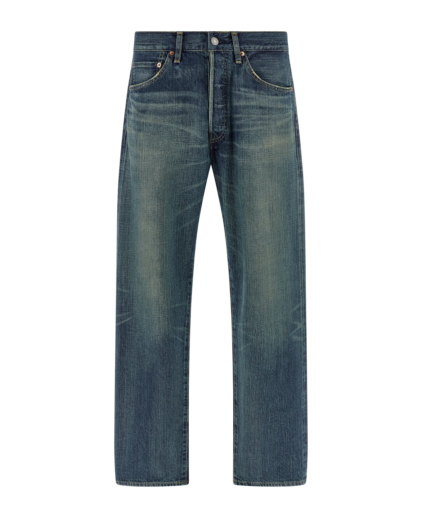 Junya Watanabe x Levi's® jeans in used-effect stonewashed cotton denim with trompe l'oeil details, contrast stitching, straight leg, front button closure, five pockets, and leather logo label at the back.