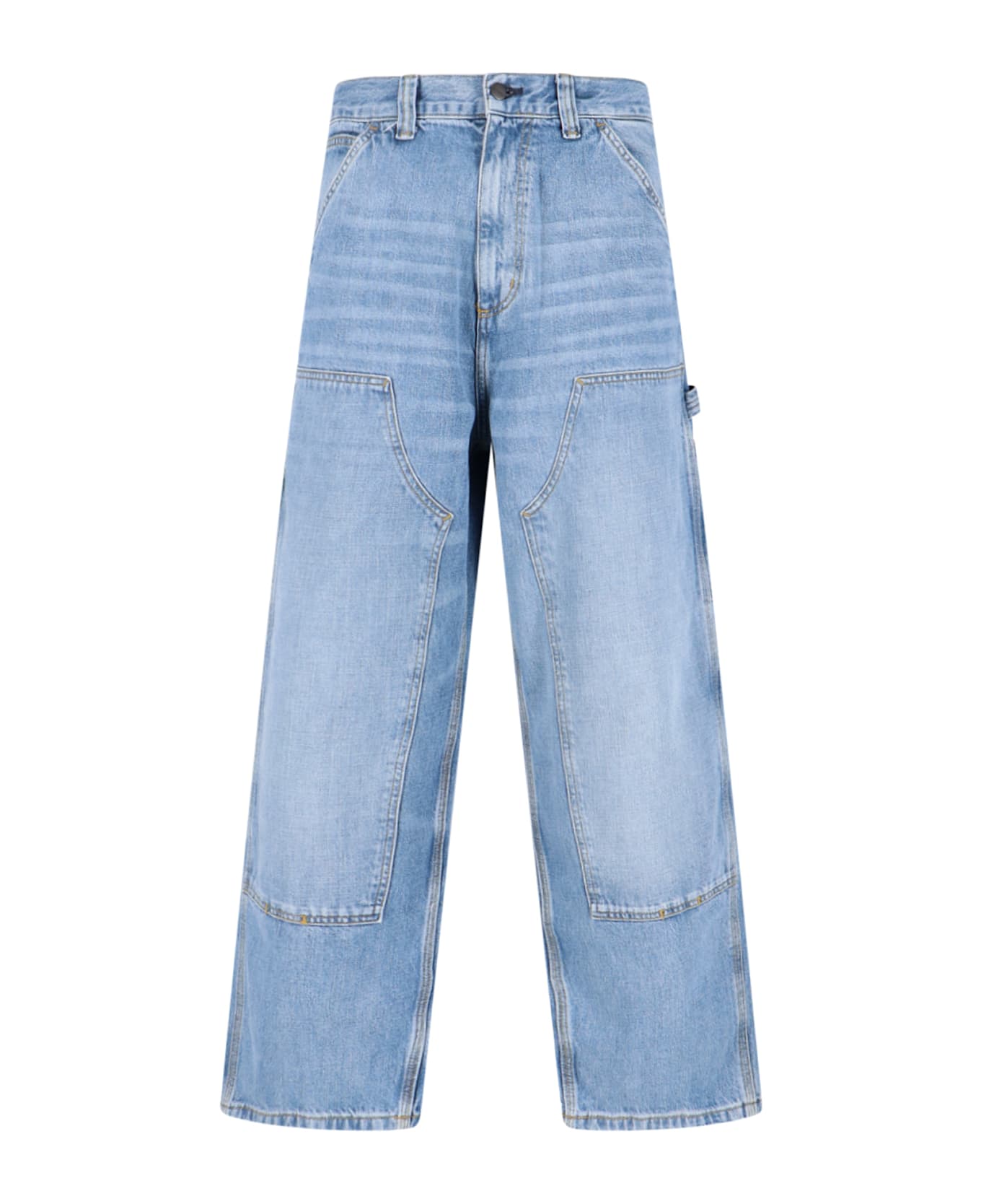 Carhartt Wip "OG Double Knee" pants in light blue denim with mid waist, belt loops, button and zip closure, two front pockets, panel detail on the front, two back pockets with logo label detail, two cargo pockets, hammer holder loop detail, wide leg.