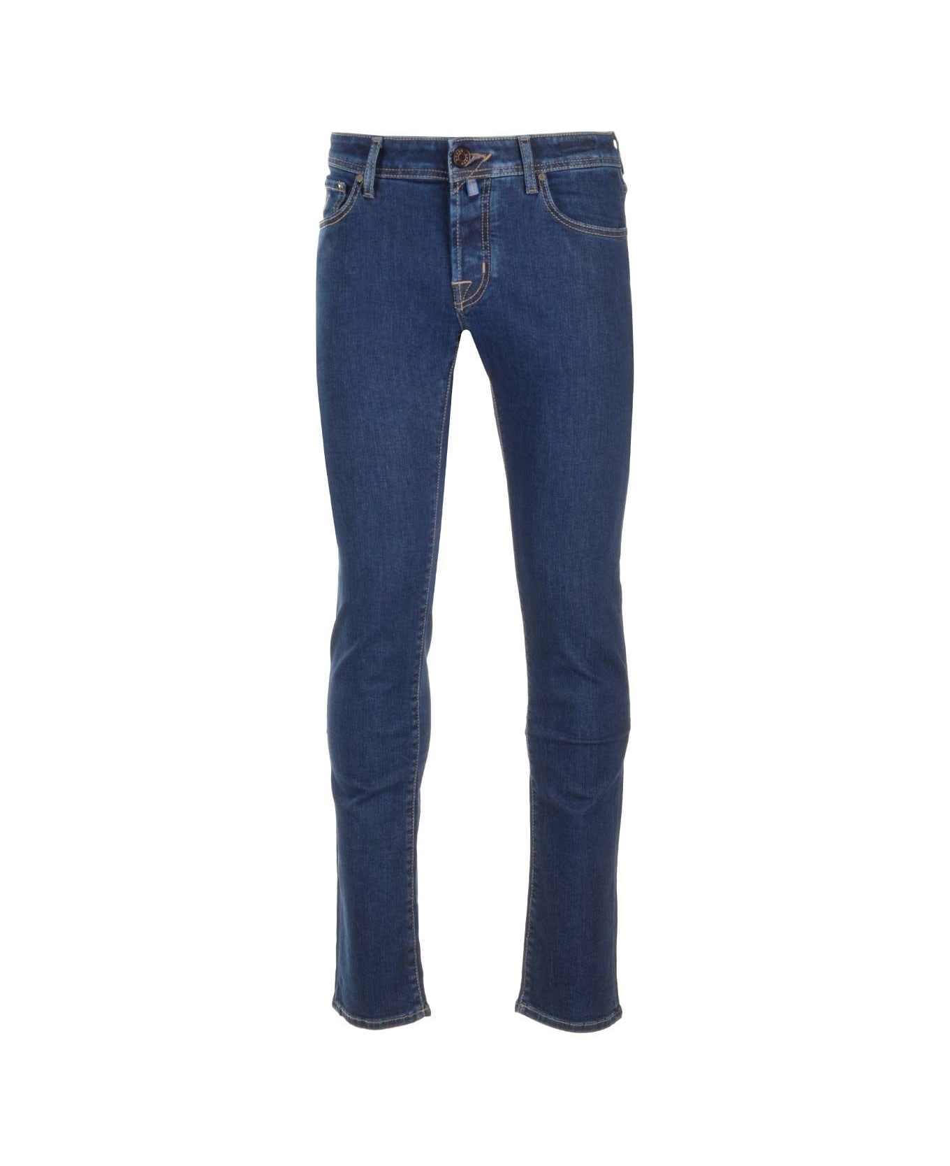 Slim fit jeans "Nick" by Jacob Cohen, with low waist, medium blue wash, leather logo tag, straight and slim leg. Pollock tag Composition: 70% CO 17% PL 11% LY 2% EA