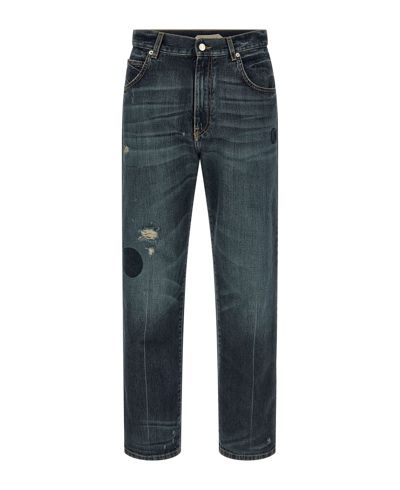 'Warkworth' jeans in cotton denim aged by brushing the entire surface and washed with stones, hand-sewn patches, contrast stitching, regular waist, straight leg, zip and front button closure, five pockets.