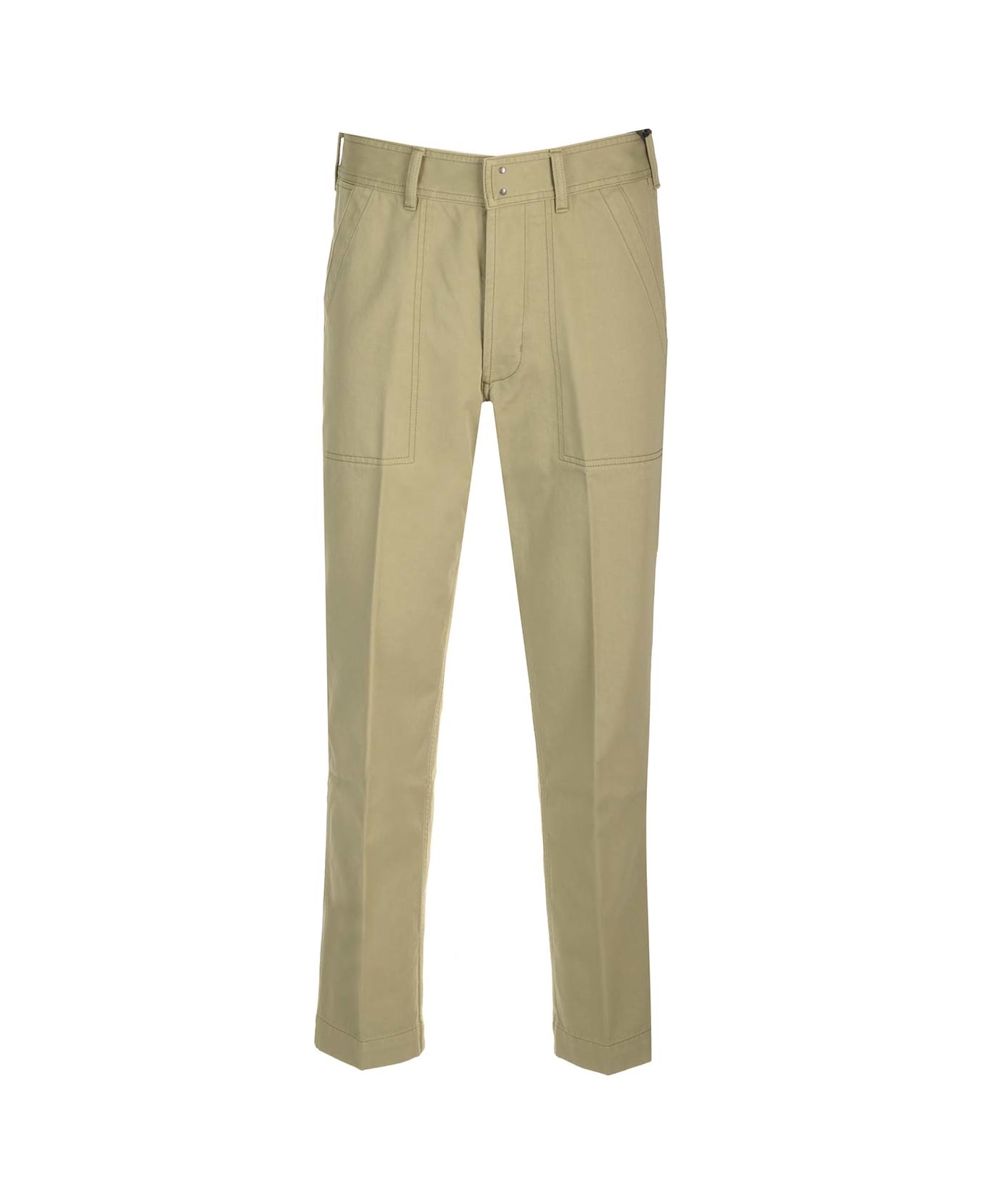 Sage green/beige cotton gabardine casual pant from Tom Ford, featuring visible stitching, concealed zip and button fastening, buttoned pockets on the back. Slim fit. Composition: 100 COTONE