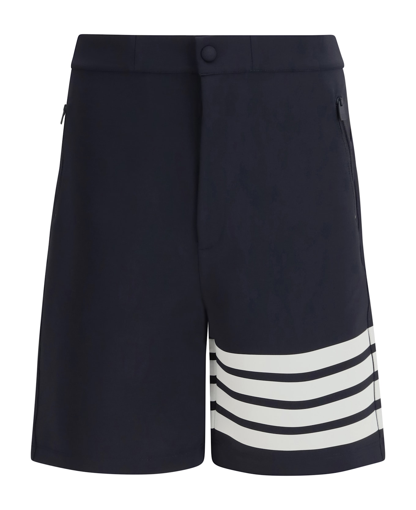The 4-bar technical shorts by thom browne combine functionality and style. they feature a zipper and button closure for a secure fit, while two side pockets with zippers and a back pocket offer practicality. the iconic horizontal bars on the thigh are the distinctive detail that makes this garment recognizable and trendy. perfect for those seeking comfort and sophisticated design.