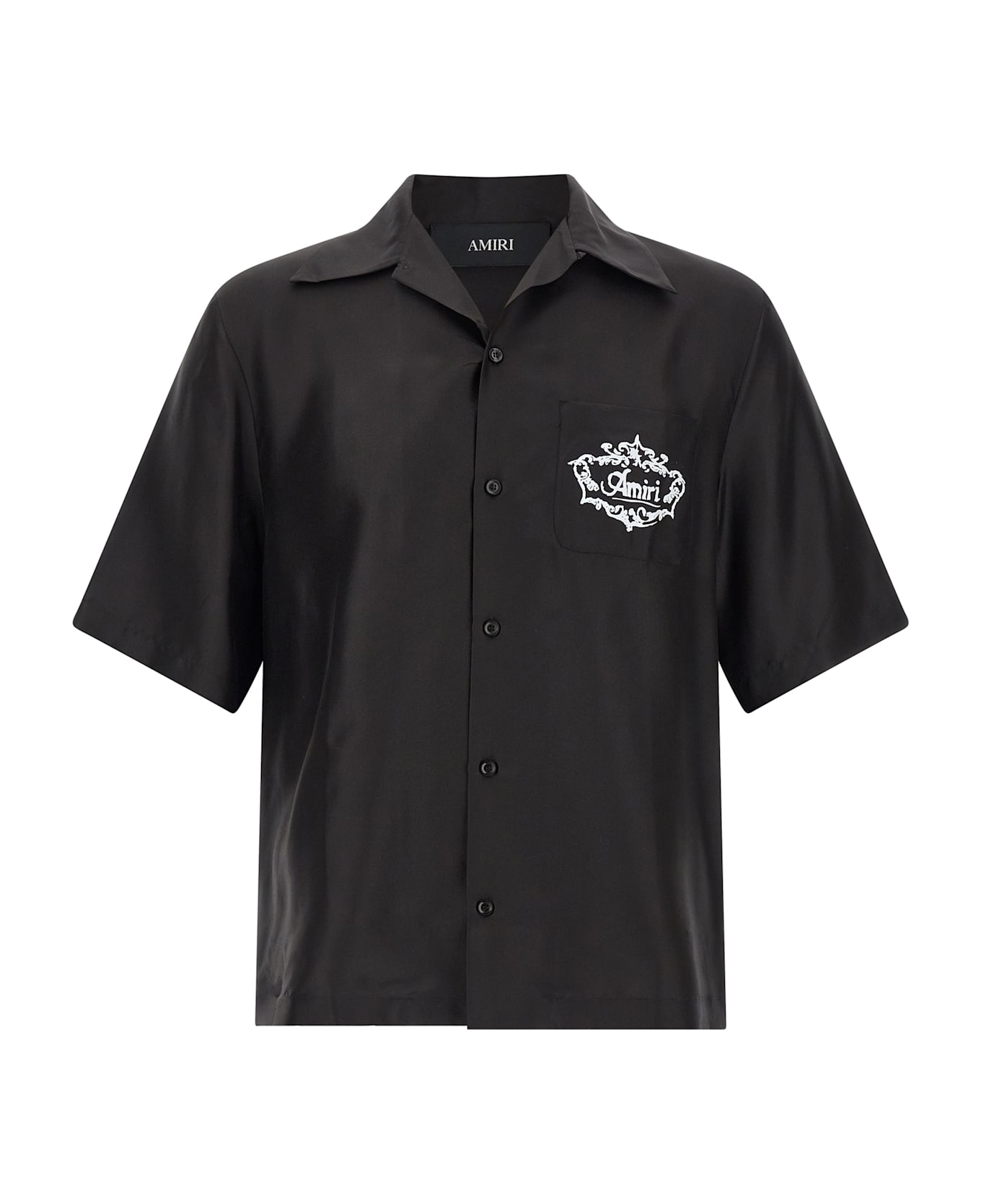 'Chateau Crest Camp' silk bowling shirt with front and back print, breast pocket, front button closure, short sleeves. This garment has undergone a special process that has resulted in intentional variations in shades and colors and adds unique characteristics to the garment.