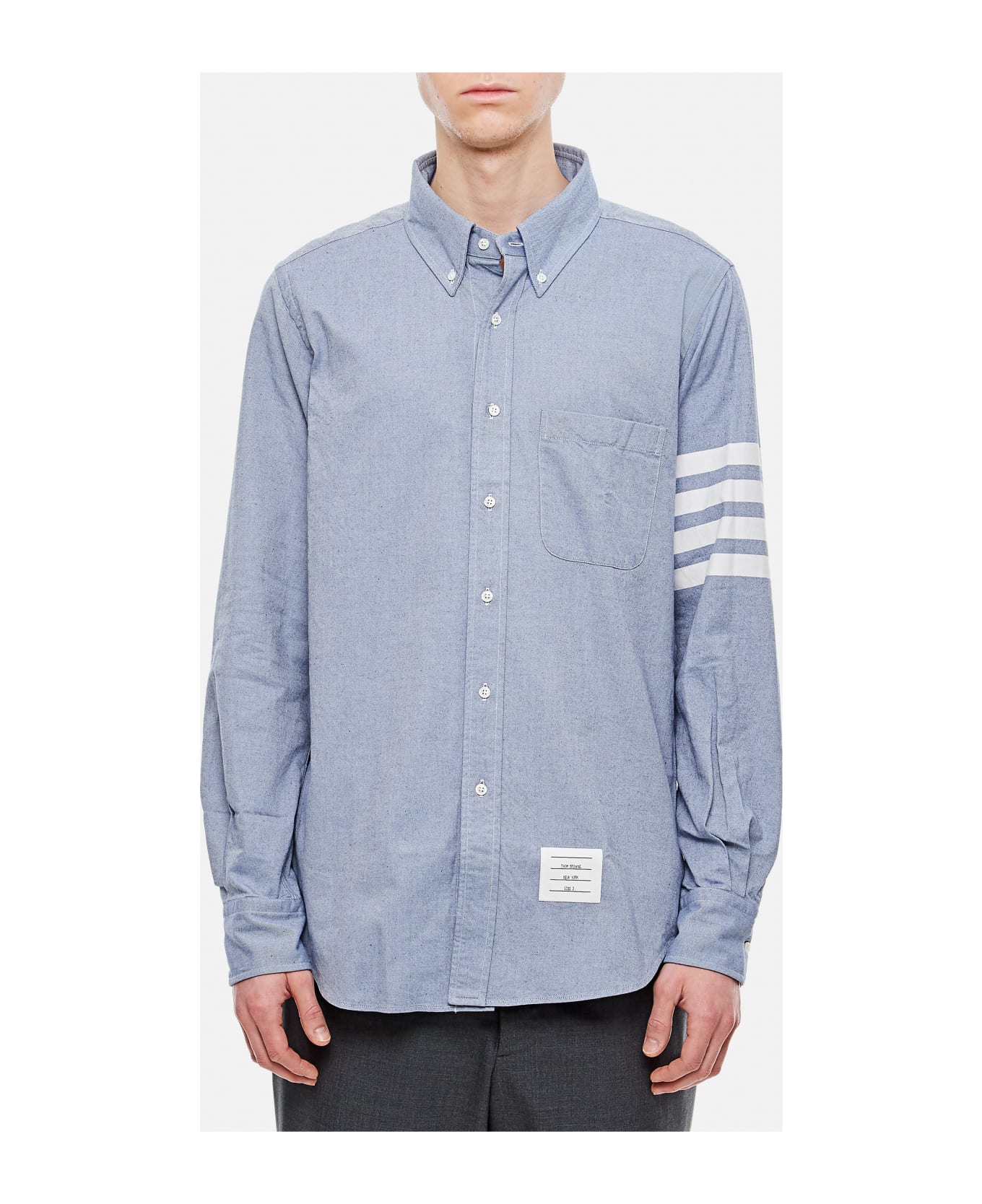 Buttondown collar. Button closure. Chest pocket. Front logo patch. Long sleeves. Buttoned cuffs. Curved hem. Back signature striped pull tab. Back pleats. Straight fit. Color: light blue. Made in Italy.