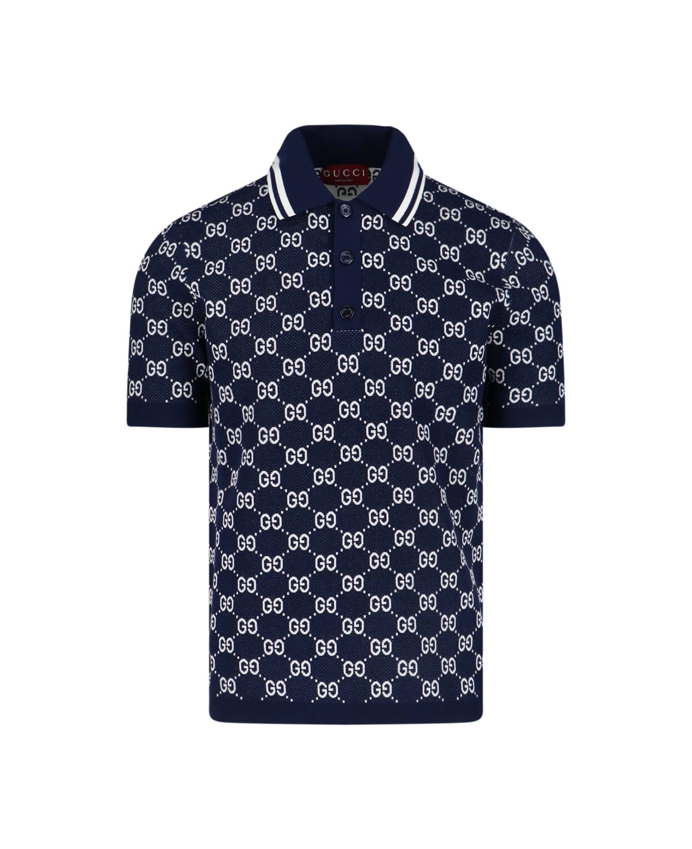 Gucci 'GG' logo shirt in blue cotton with white jacquard logo pattern, classic collar, striped pattern detail, button closure, ribbed trims, straight hem. Composition: 100% Cotton