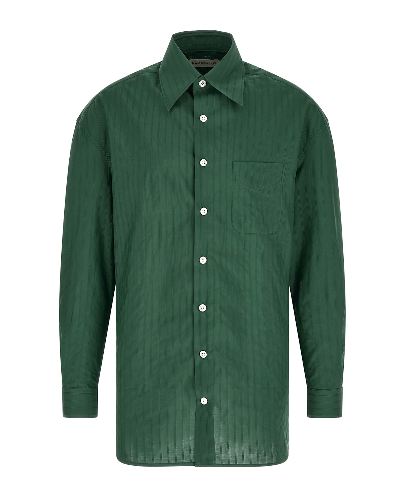'Grinda' shirt in soft cotton poplin with tone-on-tone jacquard stripes, pointed collar, breast pocket, front mother-of-pearl button closure, long bat sleeves with cuffs and dropped shoulder, back rack with cannon pleats.