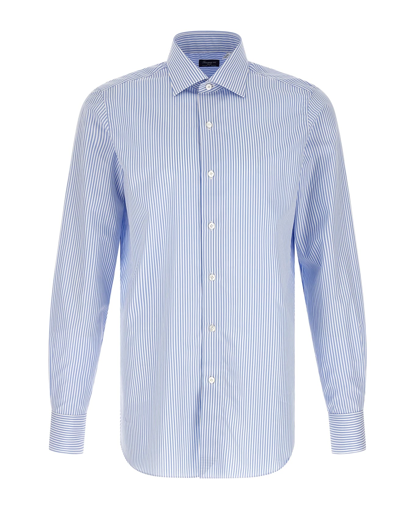 Napoli shirt in striped cotton poplin, front button closure, long sleeves with cuffs, contrasting satin logo detail on the side slits.