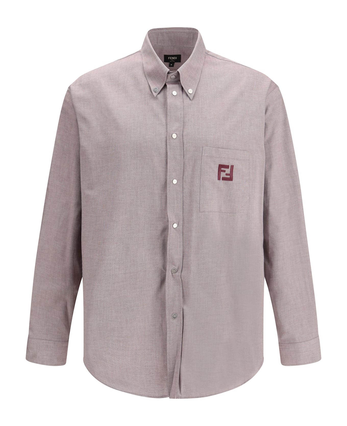 The oxford cotton shirt by fendi features a comfort fit with long sleeves, a button-down collar, and an applied chest pocket. the front closes with exposed buttons, while the iridescent burgundy oxford cotton adds a refined, luminous finish. the contrasting embroidered ff detail on the front pocket completes the piece with an iconic signature.